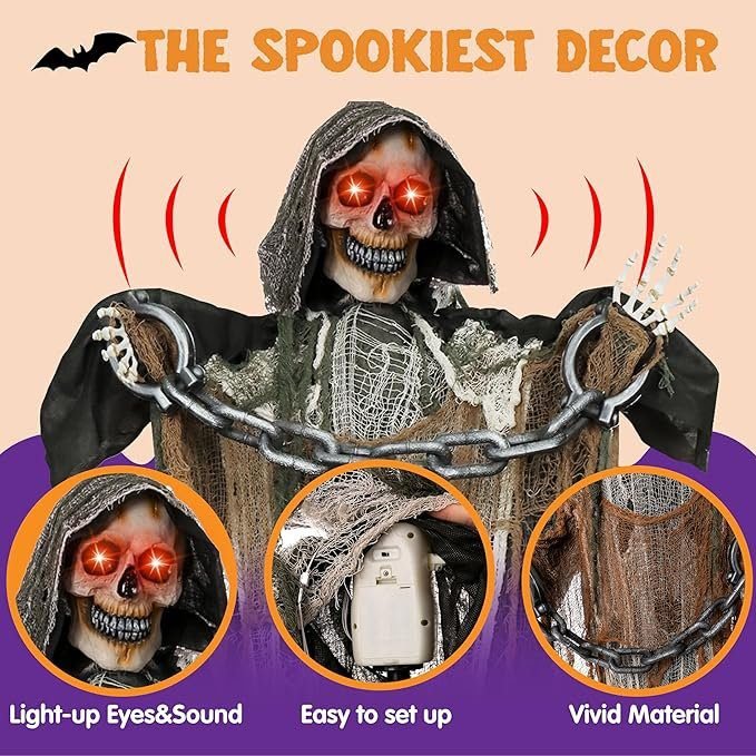 67-inch Halloween decorations, outdoor living size, 🎃🎃animated grim reaper, attached chain, lively party decorations with creepy sounds, scary haunted house props, suitable for gardens, yards and lawns