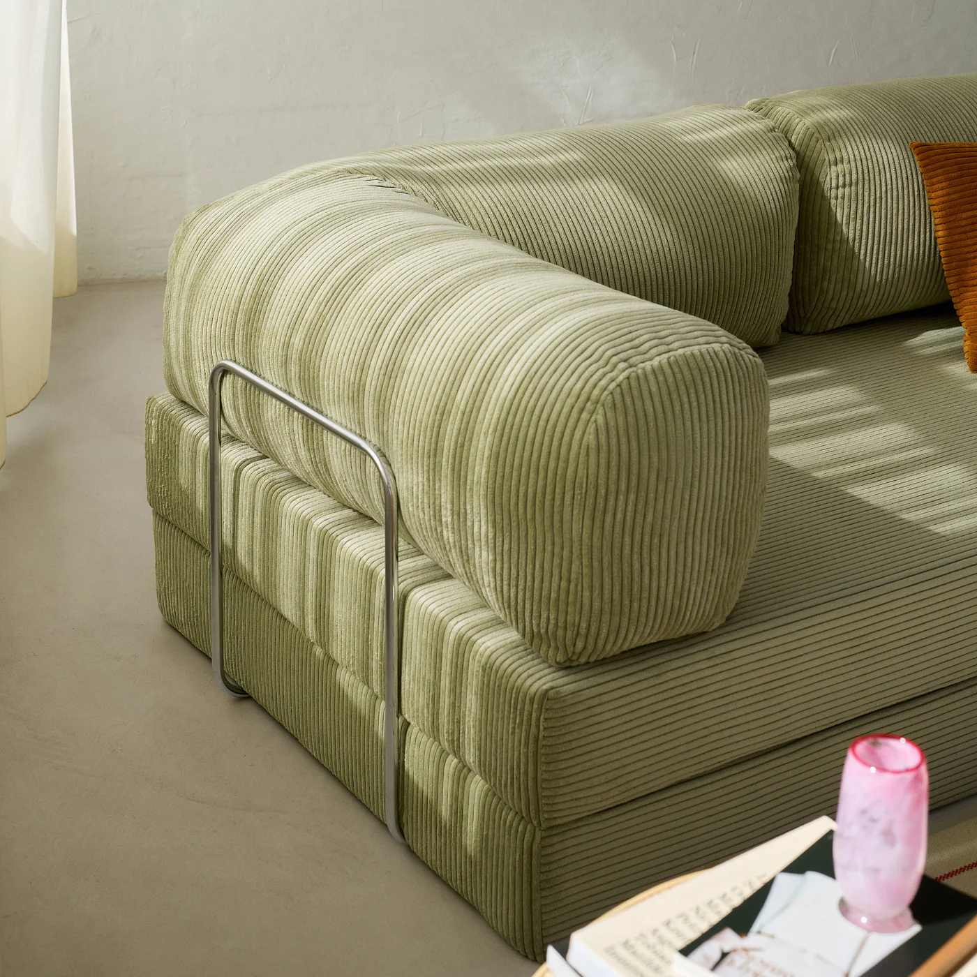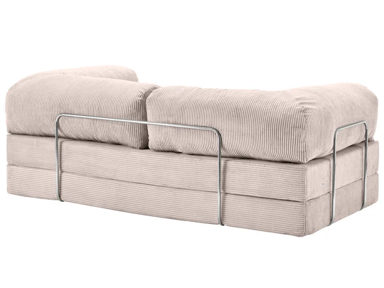 Comprising two quality mattresses and two angled cushions, TEDDY is designed for easy rearrangement. Secured by three chrome-plated metal bars, TEDDY maintains its flexibility. The mattresses, crafted from high-grade cold foam, strike a balance between firm support and comfort for both sitting and sleeping. The angled cushions are filled with silicon ball fiber encased in an inner fabric sleeve, allowing for easy removal of the outer fabric without disturbing the foam. TEDDY is swathed in plush corduroy fabric known for its exceptional quality and durability.
